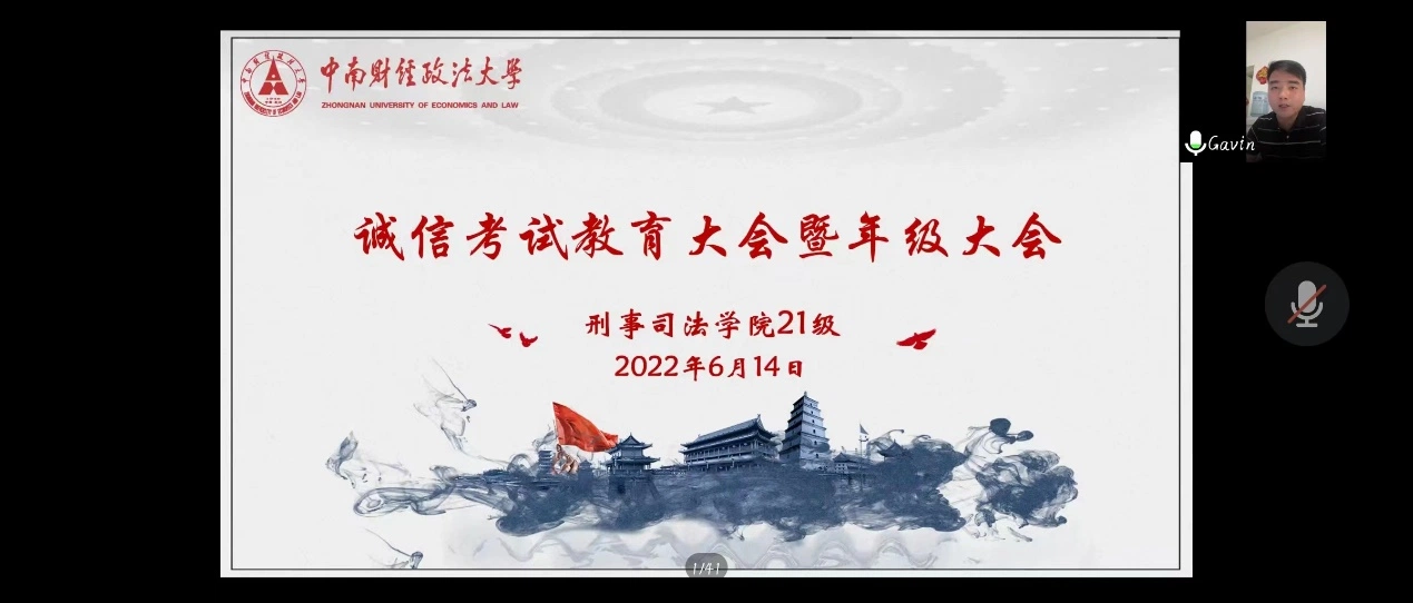 新闻网讯(通讯员 郭杨楠 陈淑娴)为弘扬诚信精神,加强同学们的诚信意识,确保同学们诚信应考、以积极乐观的心态面对期末考试,并为了让同学们有一个充实的暑假,刑事司法学院于6月14日中午12点30分召开2021级本科生诚信考试教育会暨年级大会。此次大会以线上会议的形式召开,由2021级辅导员郭青川老师主持,刑事司法学院2021级全体本科生参与。