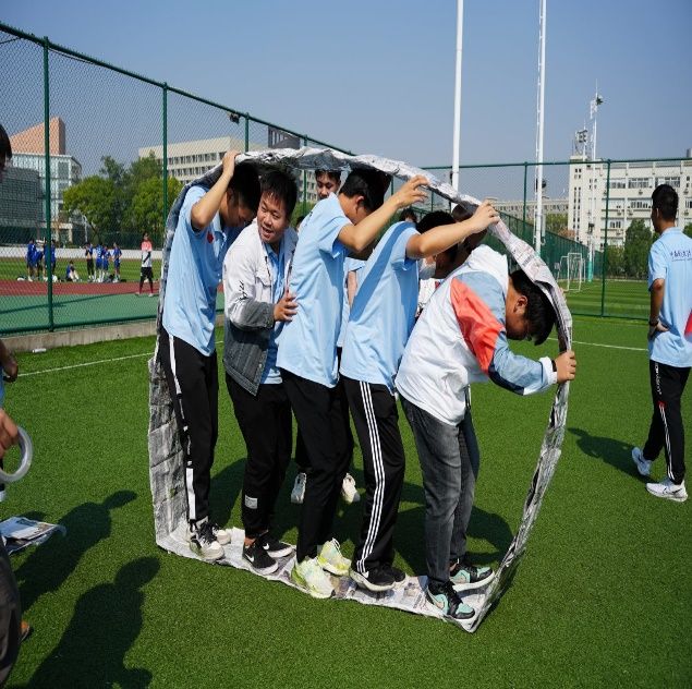 第三个挑战活动为“无敌风火轮”,所有同学分成三组,用报纸和胶带制作一个封闭大圆环“风火轮”,每组成员需要用需要计算出适合本组的报纸数量,如何进行合理的资源分配也是一大难题。在制作好风火轮之后,全体队员站在立起的圆环内,边走边滚动并使“风火轮”运行一个来回。制作和比赛总计用时最短的组获胜。在活动中,同学们通力合作、携手共进,充分考虑资源分配,共同协商最佳策略,彰显了团队精神与合作意识。