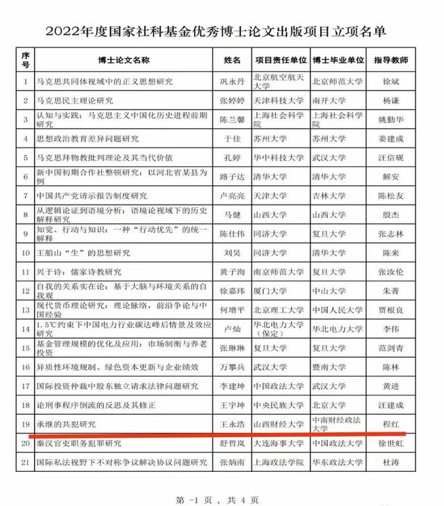 根据全国哲学社会科学工作办公室官网(http://www.nopss.gov.cn/n1/2023/0206/c431030-32618664.html)的公示信息,由程红教授指导的刑法学专业2020届博士王永浩的学位论文《承继的共犯研究》获得“2022年度国家社会科学基金优秀博士论文出版项目”立项资助。
