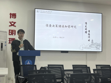 第三位演讲人是侦查学硕士梅晨卓,他演讲的题目是“侦查决策错误知觉研究”。他首先介绍了知觉的概念,然后列举了几种典型的错误知觉诱发定式,最后就侦查决策过程中如何避免受到错误知觉的影响。