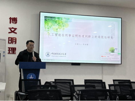 本届论坛共有三位主旨演讲人。第一位演讲人是侦查学硕士李向镪。他以“人工智能在刑事证明中的局限性和思考”为题,从证明标准的主观判断难以被取代、证据标准难以统一、证明标准判断过程的透明性难实现等三个方面论述了人工智能在刑事证明标准判断上的局限性及应对方法。演讲结束后论坛师生们就人工智能与法官在刑事证明标准判断上的优劣势展开相关讨论。