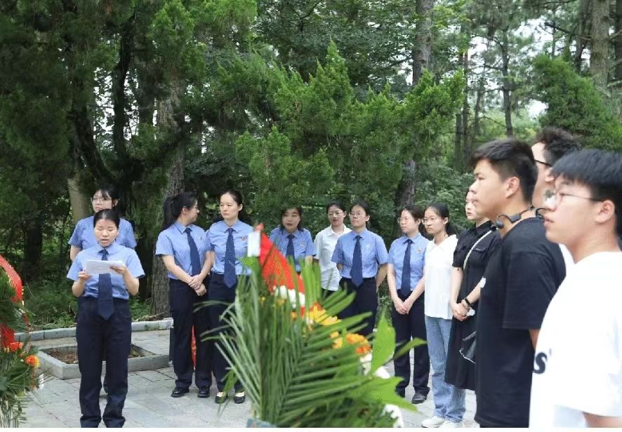 正本清源,固本培元。为进一步加强新时代青年干警的廉洁教育,强化青年干警纪律意识、规矩意识,切实筑牢拒腐防变的思想防线,在实习中期,我院实习生在梅检领导的带领下参加主题为“传承红色基因 筑牢廉洁意识 锻造铁肩担当”的廉政宣传教育活动。在庄严肃穆的宛希俨、宛希先烈士陵园内,革命烈士纪念碑巍然耸立,我院面对团旗重温入团誓词、向革命烈士敬献花篮、参观历史文化陈列馆,接受红色革命教育洗礼,凝聚奋发有为的磅礴力量。“今天的美好生活,都源于先烈们血与汗的无私奉献,正是他们抛头颅、洒热血,我们才得以安宁幸福地生活,我们应该继承革命先烈的遗志,学习他们的精神意志。”同学们心得如是。这也在时刻提醒同学们在今后的学习生活中,要把纪律规矩挺在前列,时刻保持清醒的头脑,进一步提高廉洁自律意识。