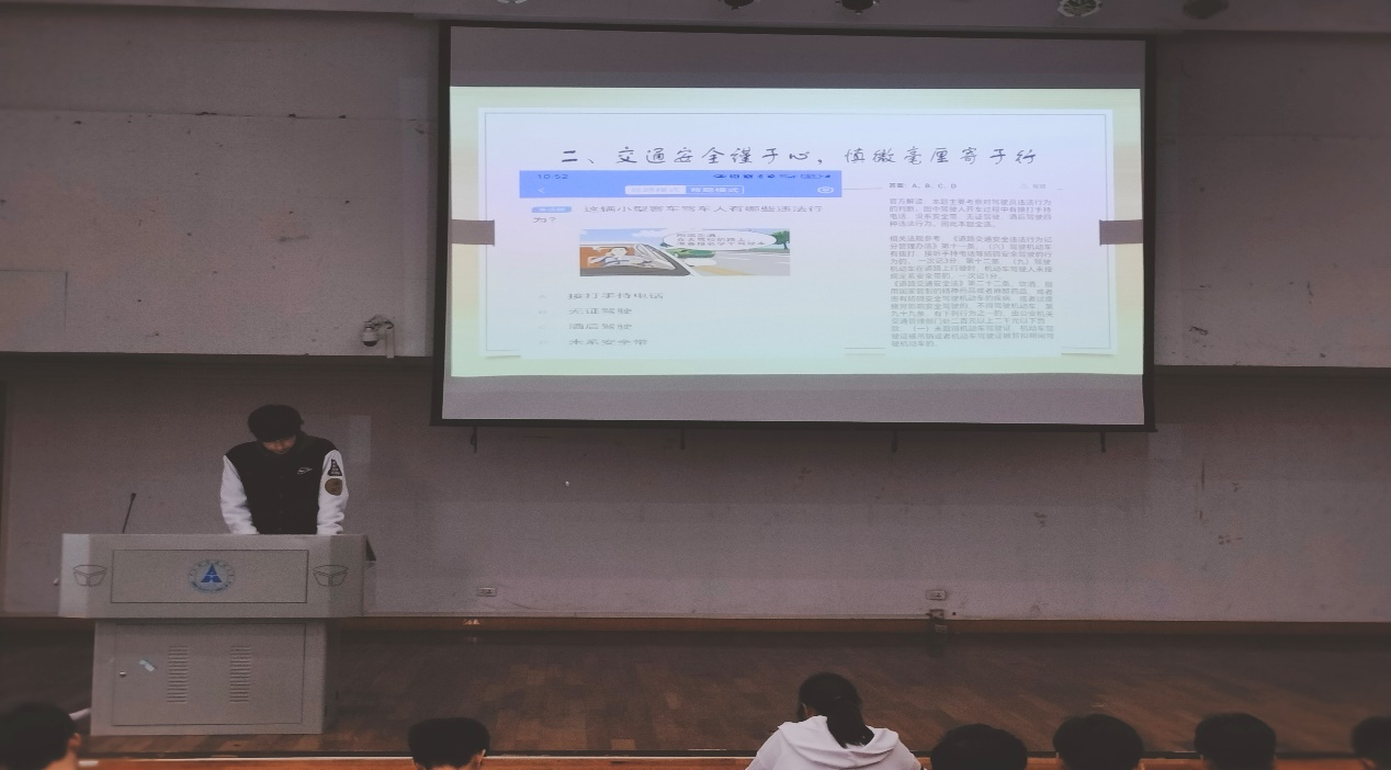 第二部分内容主题为“交通安全谨于心,慎微毫厘慎于行”。团支书以最近校园发生的交通事故为切入点,强调牢记交通安全,防范未知危险的重要性。在这一环节中,团支书通过趣味的交通知识问答牢牢吸引了同学们的注意力,通过询问同学们一些基础的交通安全问题来了解大家对于交通安全的重视程度。经过测试,团支书发现同学普遍对交通安全十分重视。此外,团支书还介绍了与交通安全有关的其他知识,帮助同学们对交通安全有更加深入的了解。