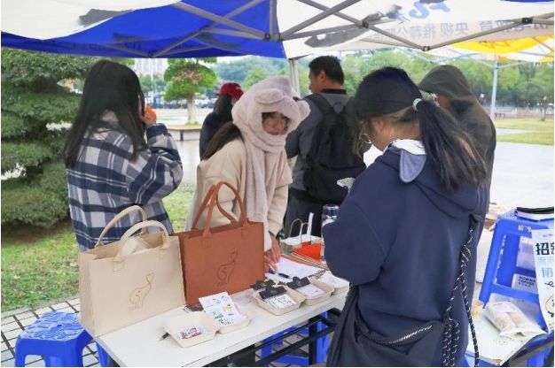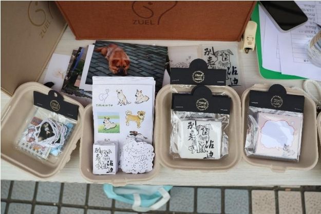 下午3时许,五羊广场前已经聚集了大批慕名而来的爱心人士。长期生活在野外的流浪狗往往对人类抱有较高的警惕性,在不熟悉的情况下就靠近,可能会让他们感到恐惧。走近五羊广场中央的摊位前,在场工作人员正耐心地向师生们介绍活动参与规则和文明待犬知识。桌上,是流浪汪守护协会自主设计的流浪犬文创产品,精致美观的贴纸、卡套、明信片、布袋上印着流浪犬的卡通形象,这些生动活泼的图案都是在校内流浪狗的形象基础上设计而来。活动现场还设有旧衣物捐赠点,号召爱心人士为流浪犬捐赠棉衣棉垫,帮助改善校园内外流浪动物的生存状况。现场师生纷纷慷慨捐助,希望无家可归的小生命们安度凛冬。