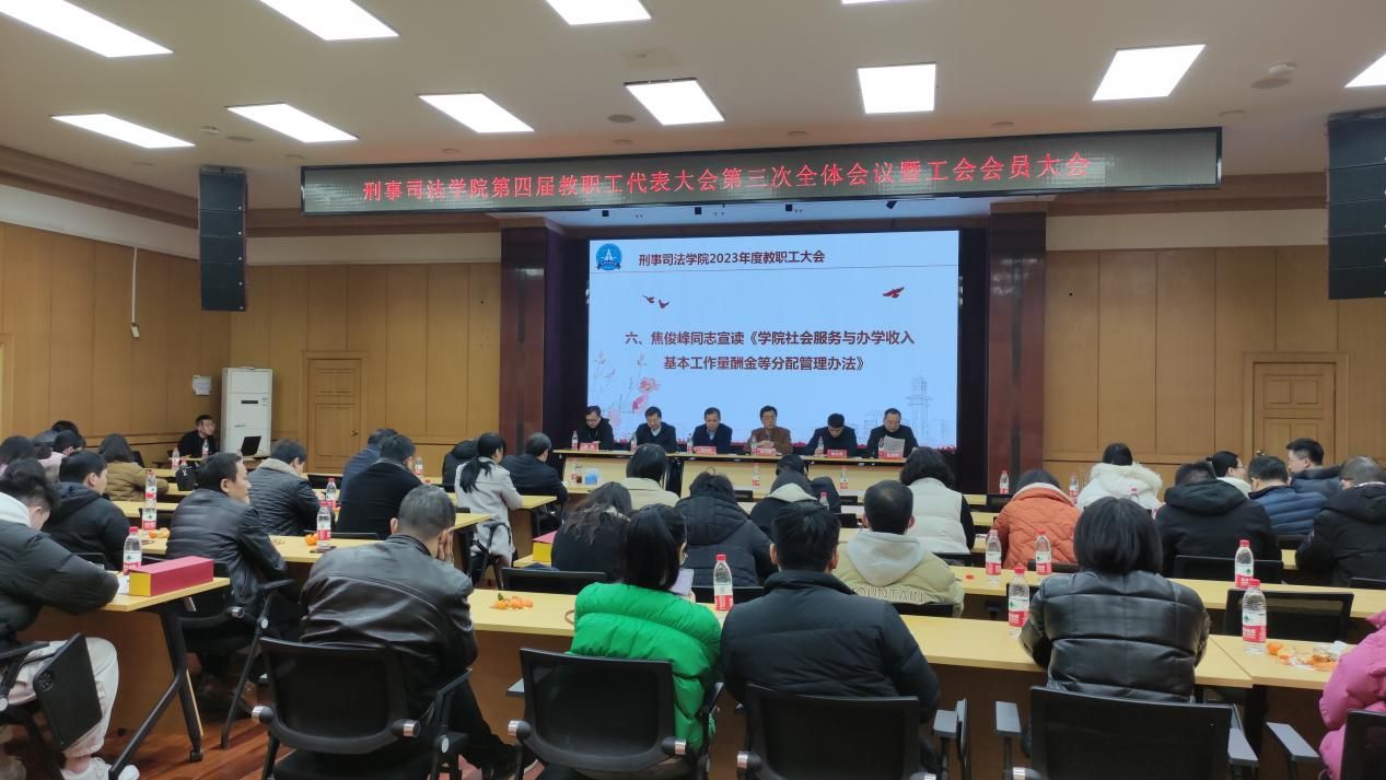 新闻网讯(通讯员 柯希鹏)1月11日下午,刑事司法学院2023年度全体教职工大会暨工会会员大会在文潭楼四楼报告厅举行。会议由刑事司法学院党委书记张志刚主持,学院全体教职工参加了会议。