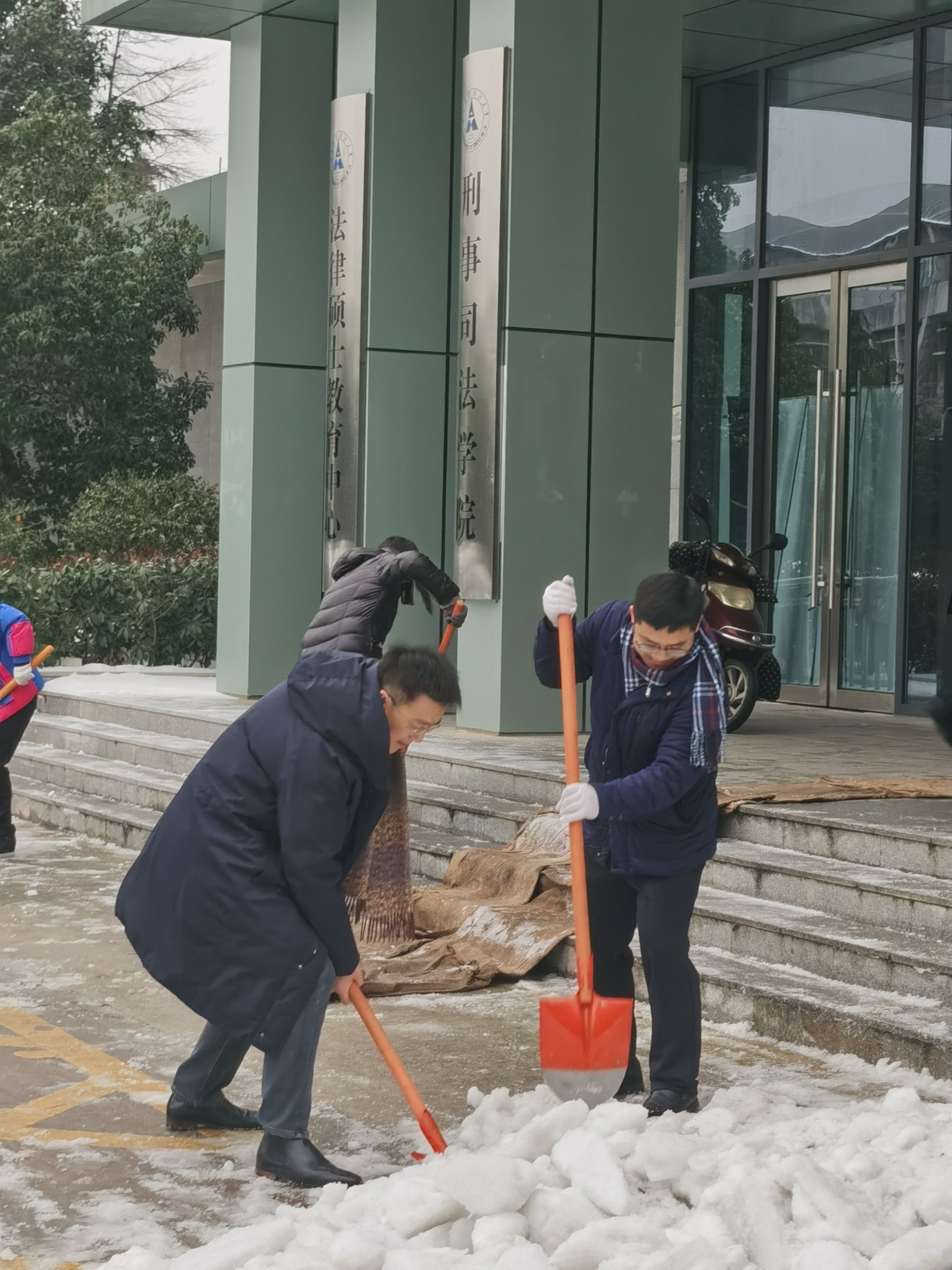 “照水冰如鉴,扫雪玉为尘”,2月24日、25日,刑事司法学院师生志愿者团队齐心协力,不畏严寒开展破冰除雪行动。尽管天气寒冷,冰层坚硬,破冰除雪非常困难,但大家却干劲十足,配合默契,铁锤破冰,铁锹铲冰,在文治楼、文清楼、文泓楼、环湖宿舍区等学校主干道和重点区域,清扫出一条条“暖心路”“安心路”,以实际行动诠释了刑事司法学院师生的责任和担当。
