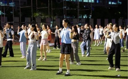 紧接着,领舞们带领大家进行热身运动,同学们跟随音乐节奏尽情舒展身体,为接下来的舞蹈环节做好充分准备。