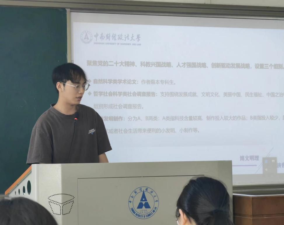 活动第二项,支部青年吕长骏对“挑战杯”比赛章程和具体细则进行了解读。“挑战杯”包括大赛分组、赛事变化、赛程安排、参赛形式、“揭榜挂帅”专项赛五个部分,每个部分都较为关键。解读过后,同学们对于赛事进程、参加方式等有了初步认识。