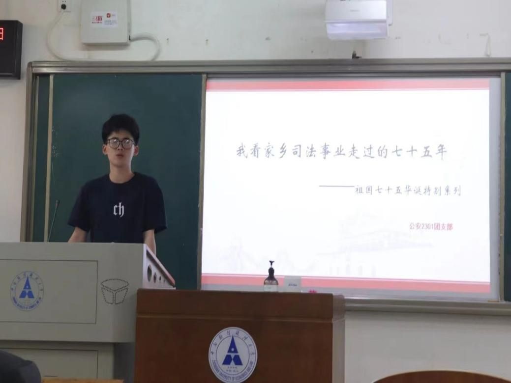 活动第三项,为迎接新中国75华诞,公安2301红旗团支部充分结合自身特色,特别开展了“我看家乡司法事业走过的七十五周年”专题系列活动。本期活动由团支部成员陈浩天同学进行分享。陈浩天同学向大家介绍了广东司法事业从新中国成立至今的巨大进步,以及当地政府如何通过高质量党建引领广东司法事业的高质量发展。通过他的介绍,大家深刻领悟到了新中国成立75年来司法事业的发展与巨变。