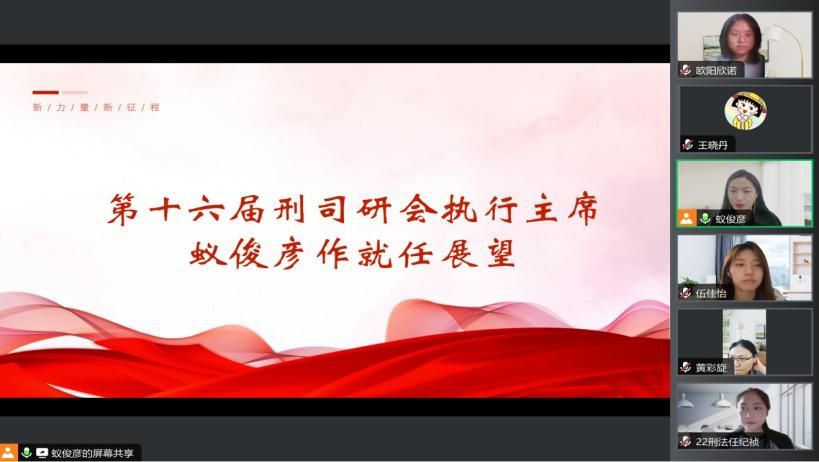 新闻网讯(学生通讯员 欧阳欣诺)为推进研会组织建设,加强内部凝聚力,做好研会承上启下工作,完成新旧负责人工作交接,7月3日上午9时,刑事司法学院第十六届研究生会换届大会于线上召开,刑事司法学院研究生会指导老师王晓丹出席,刑事司法学院第十五届研会负责人与第十六届研会负责人参加。