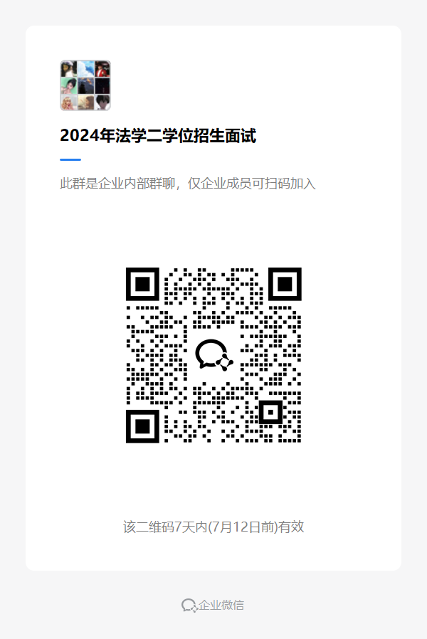 (二)考试采用线下面试的方式进行,资格审核通过名单的同学须于2024年7月5日晚10点前扫码进入企业微信群,面试通知见群通知,二维码如下。