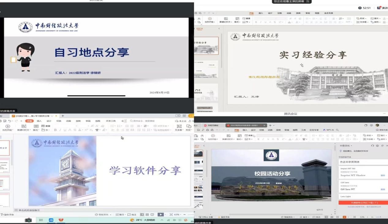 紧接着,在学习与实习经验分享环节,王烁宏同学针对刑法学论文选题与写作进行细致说明并指出注意事项;徐锦妍同学为大家指明图书馆、教学楼和咖啡厅等校内外自习地点;王津同学强调实习的重要性,并结合个人经历提供了宝贵经验;冯思琪同学则就研究生期间各类学习软件的使用分享了心得体会。