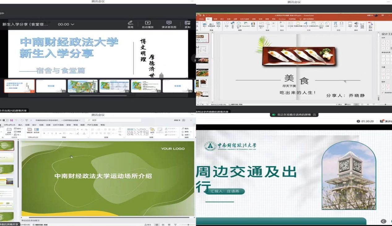 随后,在日常生活方面,袁凌凌同学围绕校园内丰富多彩的学术、文艺、体育活动展开介绍;谢晖同学、乔晓静同学针对校内住宿与校外美食分别进行详细讲述;张静童同学建议在学习之余要不忘强健体魄,并为同学们推荐校园内运动场地;庄语燕同学则是总结了周边交通的实用信息以便大家日常出行。
