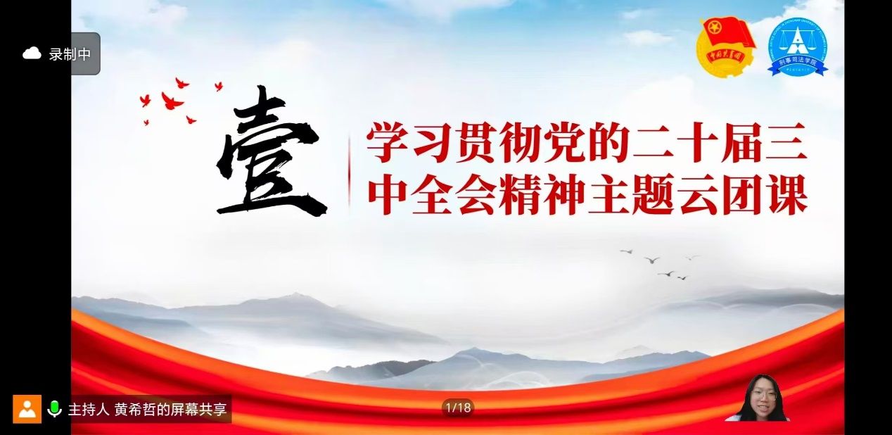 为深入学习贯彻习近平新时代中国特色社会主义思想,引导新生学习贯彻党的二十届三中全会精神,做好2024届新生入学准备工作,同时增进学生与家长对学校、学院的了解,8月24日14:30,刑事司法学院分团委召开2024年线上迎新活动暨学习贯彻党的二十届三中全会精神云团课。会议采用线上直播形式进行,刑事司法学院2024级全体本科生及家长参与此次团课,团课由刑事司法学院黄希哲同学主持。