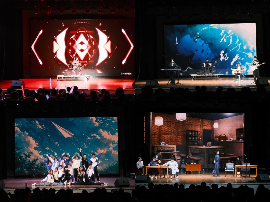 迎新晚会在先导片和胡炜韬同学热血沸腾的架子鼓独奏结束后正式拉开序幕。乐器合唱队以悦动的旋律演奏一首《行走的鱼》,鼓励人们张开怀抱,拥抱自己的不足。舞蹈串烧《青春序曲》中,同学们的每一个动作都充满了力量与柔美、每一个转身都洋溢着青春的活力与激情;话剧《茶馆》带领同学们穿越时空,回到波谲云诡的民国初年,在对话中感受小人物的悲欢喜乐与大时代的风云变幻。