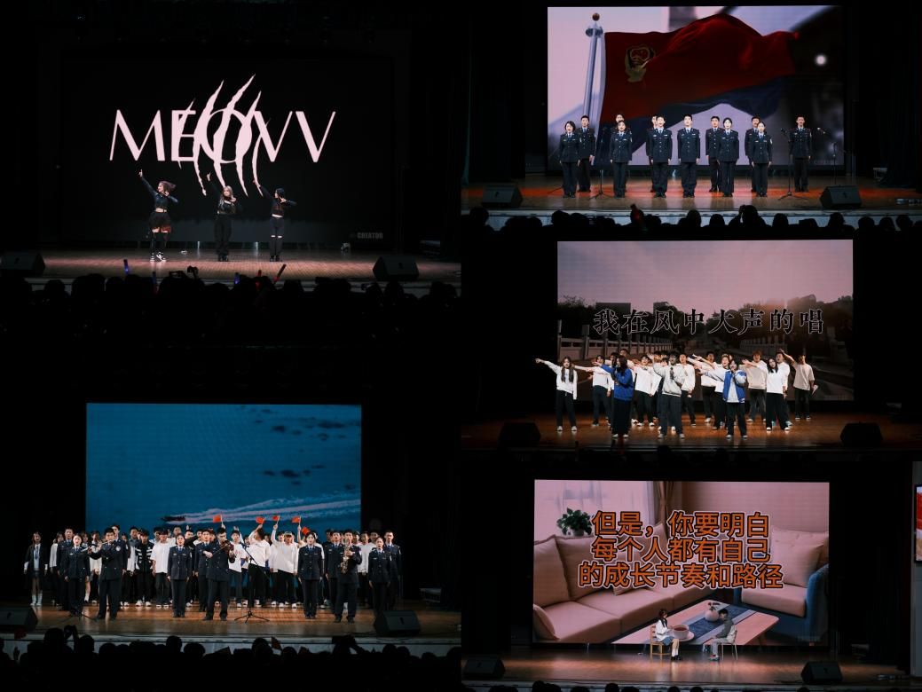 在合唱《改变世界》、《致爱》与《淘汰》的悠扬旋律中,同学们以饱满的热情展现了他们对生活的热爱,手中的荧光棒犹如点点星光摇曳,将现场氛围推向顶点。随后,一曲《小城夏天》以舞蹈的形式呈现,引领着大家置身于热烈而灿烂的夏日,海风带着微咸与清凉,轻轻拂过每个人的脸颊,带来一丝丝心旷神怡。紧接着,刘祖浩带来的舞蹈《故乡》,以深情细腻的演绎将同学们的心灵牵引回了那个充满温情与回忆的家乡,让人沉醉在对故土的深深眷恋之中。最后,一曲雄壮而深情的《我爱你,中国》响彻全场,表达着青年大学生对祖国母亲最真挚深沉的爱与敬意,将晚会氛围推向了高潮。