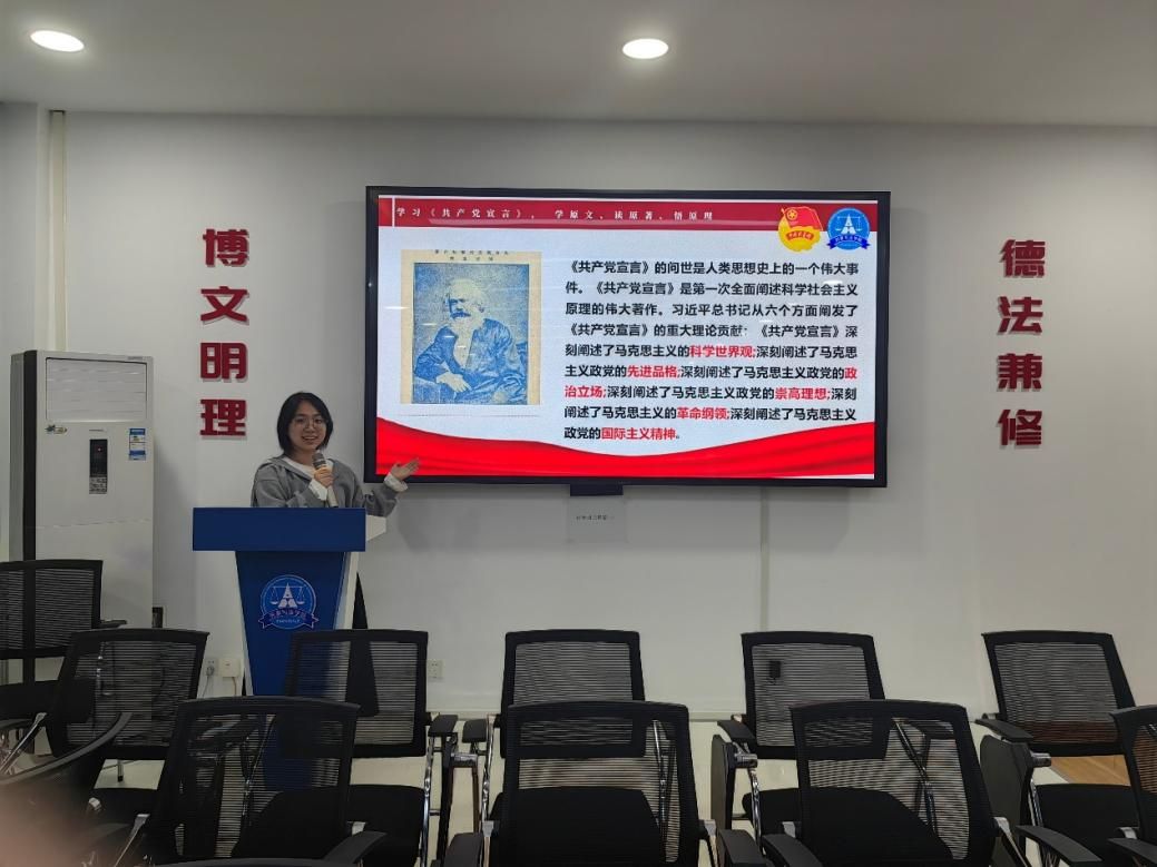 随后,与会团员青年共同学习了《共产党宣言》。在交流分享环节,学生会主席团成员黄希哲分享了学习心得。她表示,通过学习《共产党宣言》一书,深刻体会到了马克思主义的思想力量和对社会经济问题的深刻洞察力,激励着广大青年积极投身社会实践,贡献青春力量。