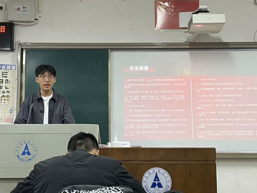 活动第一项,由团支书进行消防安全知识的科普与讲解。团支书列举了存在于日常校园生活中的安全隐患,对火灾大小进行了分类和等级划分,并介绍了四种灭火方法的基本原理。通过讲解专业科学的消防知识,同学们能够对火灾进行科学有效的评估,从而采取正确合理的行动规避安全隐患,防患于未然。
