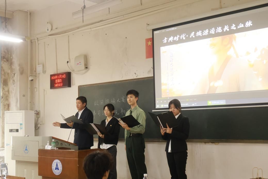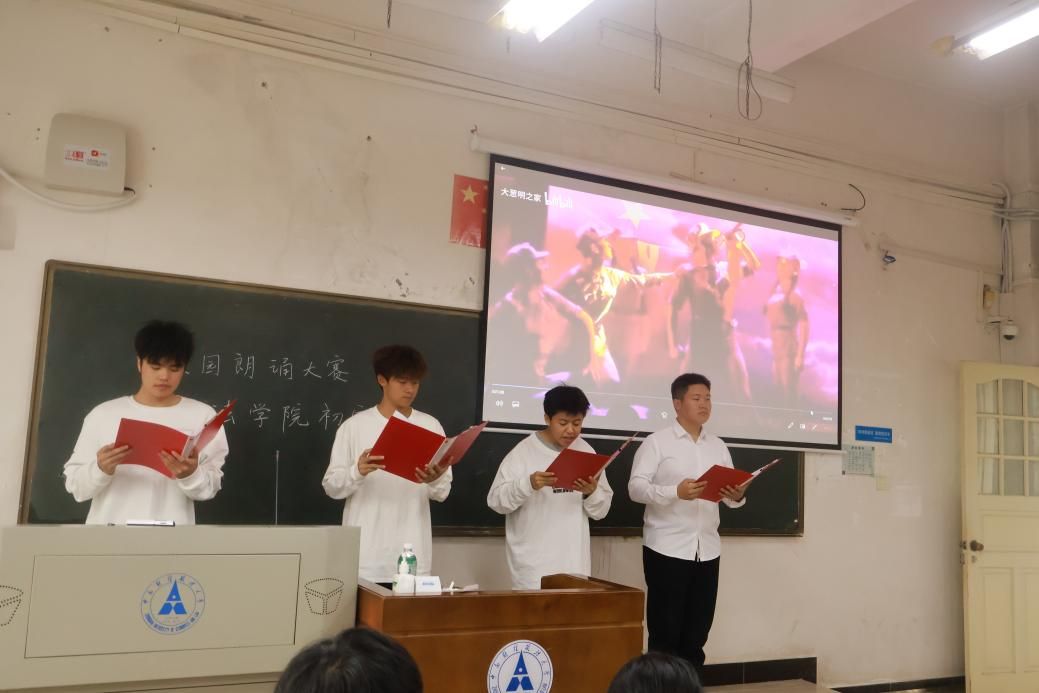 随后出场的同学抑扬顿挫地为大家朗诵《商鞅》,复刻了春秋战国的悲壮史诗。接着四位同学齐诵《百年沧桑》,带领我们体悟过去一路走来的酸甜与苦辣,艰辛与汗水。《大写的中国》《长江颂》《吹号者》的出现,使人们心中的家国情怀与民族精神油然而生,先辈们的红色征途历历在目,让人久久不能平复。