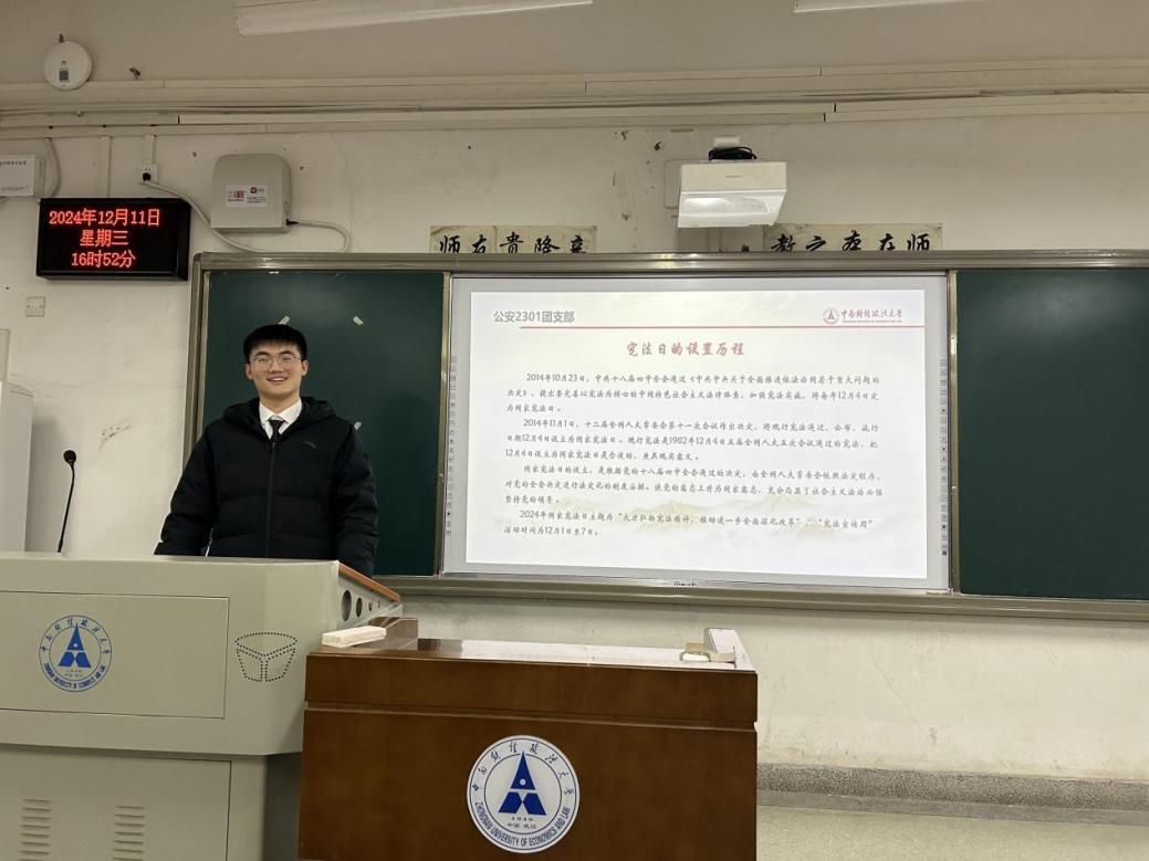 新闻网讯(学生通讯员 李博宇)12月11日,公安2301团支部开展“学宪明规扬正气,守章循法筑根基”主题团日活动,通过宪法条文解读、案例剖析等形式,引导团员和青年学习宪法知识,弘扬宪法精神。