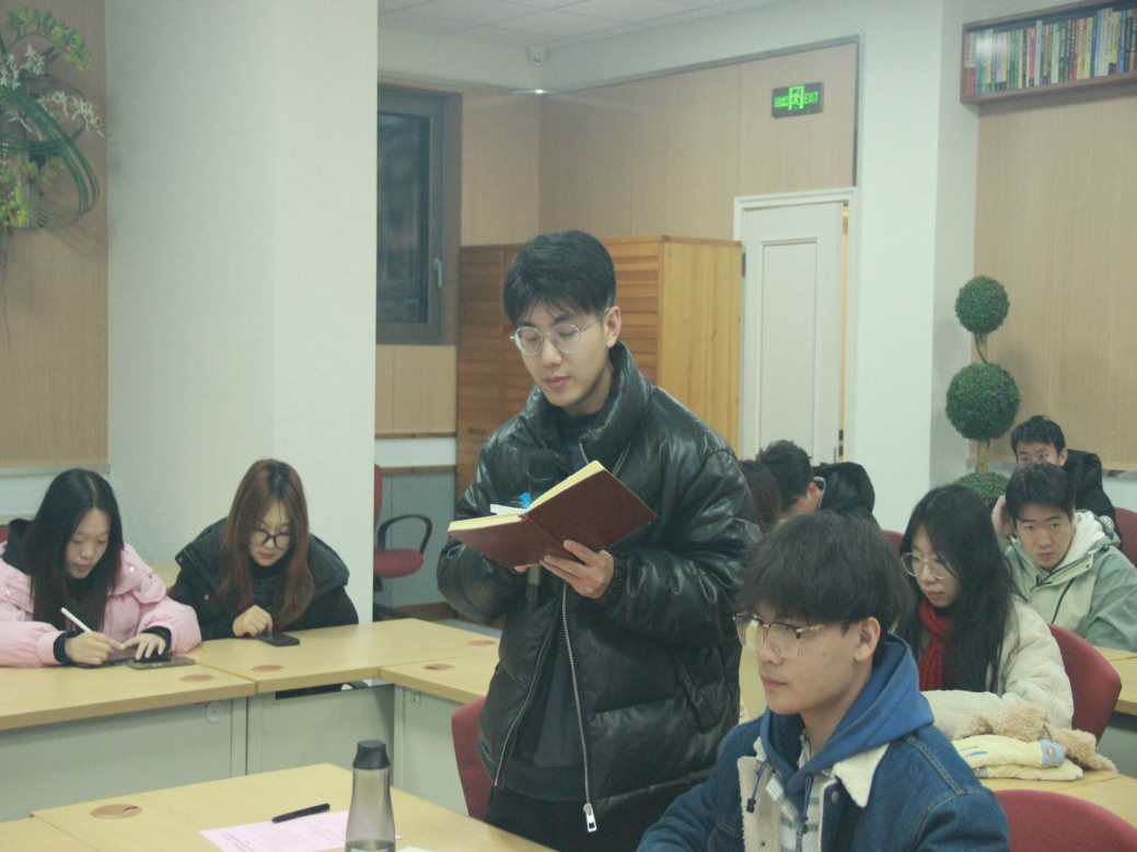 新闻网讯(学生通讯员 姚知瑞 石咏和 罗依)为进一步加强对青年的理想信念教育,引导广大团员青年爱读书、读好书、善读书、学理论、读经典、促实干,12月12日,刑事司法学院学生会于元照图书馆二楼会议室举行了“为中国式现代化挺膺担当——‘青春年少好读书’”读书季第七期活动。刑事司法学院分团委书记张凡稷、校团委组织部副部长向柯颖、校团委宣传部副部长任相安、校大学生创业实践中心执行副主任张煜祥、校红十字志愿服务队副队长李鑫以及刑事司法学院第二十六届团学组织主要负责人参加本次读书会。