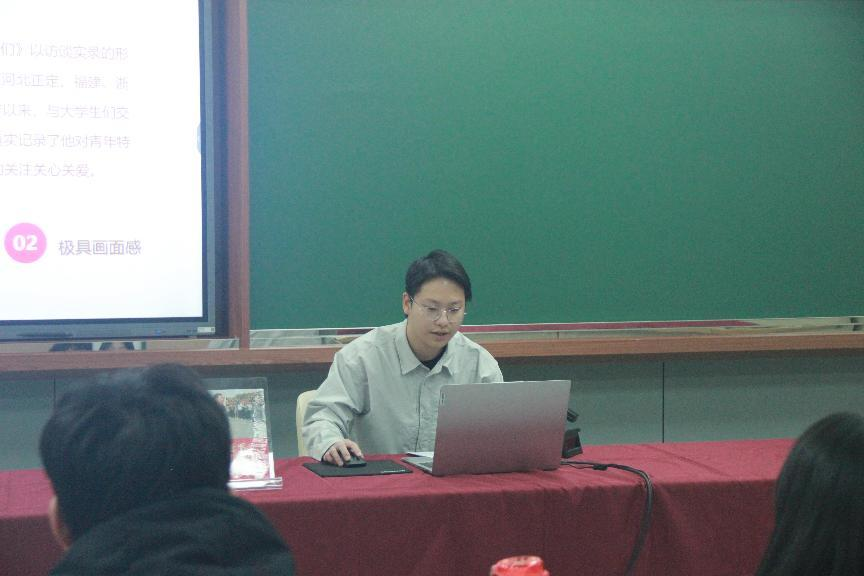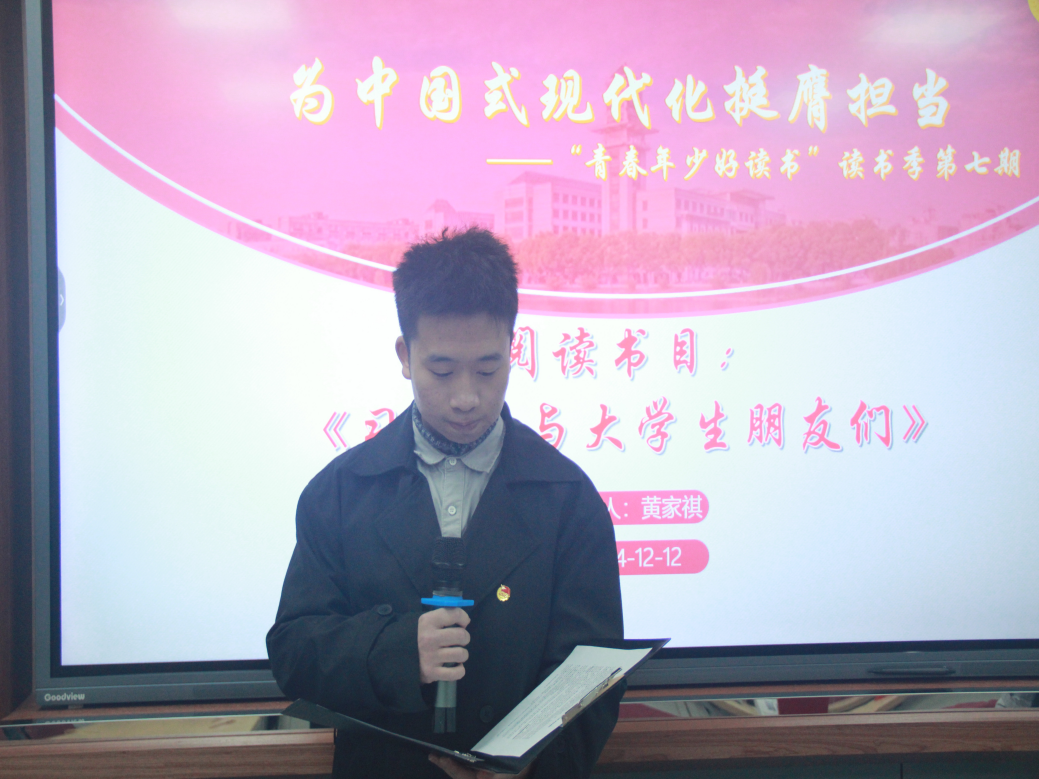 活动第二项,由刑事司法学院团委组织部部长黄家祺带领大家学习《习近平与大学生朋友们》一书的主要内容。黄家祺同学提到,本书通过49篇访谈实录,讲述习近平总书记深入高校调研考察、关心指导大学生的故事。黄家祺同学提到,新时代大学生应当以“立大志、明大德、成大才、担大任”为目标,练就过硬本领,勇于开拓创新,贴近基层实践,矢志不渝,艰苦奋斗,凝心聚力,真抓实干,开拓创新,为时代的蓬勃发展注入青春力量。