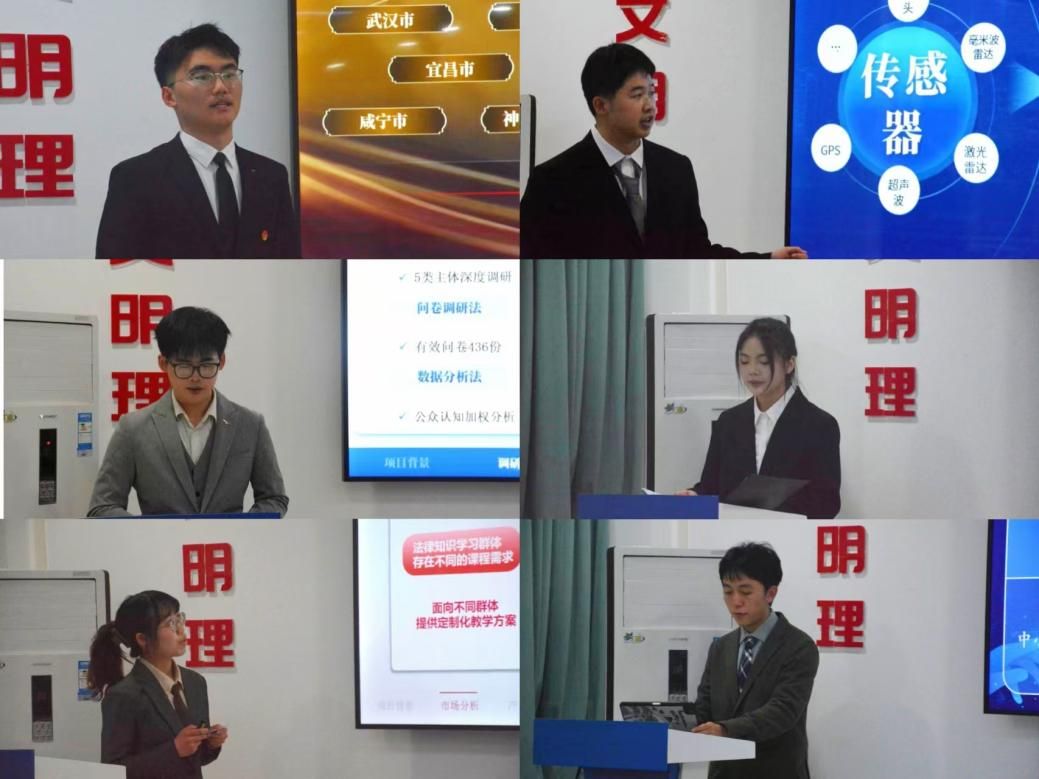在创新类赛道的展示环节中,各团队依次呈现了多个前沿研究项目。首先是以端到端技术为核心的自动驾驶风险规避与社会治安问题研究;随后是网络犯罪侦查中公私合作机制的构建探索;接着是校园欺凌防治领域的AI预警与心理教育协同赋能体系;此外,还有针对金融法治与“反催收”黑灰组织的甄别预警及治理机制研究、基于大数据证据的刑事庭审困境与破解研究、黄精产业产学研融合的实地调研与分析,以及数智赋能下跨境虚拟货币洗钱犯罪证据固定的技术实现。区块链与云端智库的结合、缓刑撤销制度中漏罪发现标准的类型化分析、刑事涉案虚拟货币处置的困境与出路,以及基于博弈论的网络刷单返利诈骗预警劝阻机制创新等研究也相继亮相。