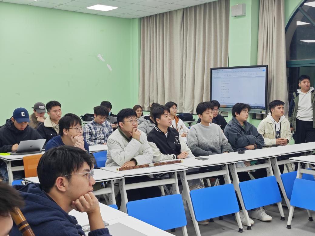 随后,毕小炜同学以一曲《秦川抒怀》震撼全场,竹笛声中尽显西北大地的粗粝与柔情。在互动教学环节,毕小炜同学通过实物演示,拆解了“颤音”“滑音”等笛子吹奏的基础技法,并指导同学们体验气息运用与指法转换。