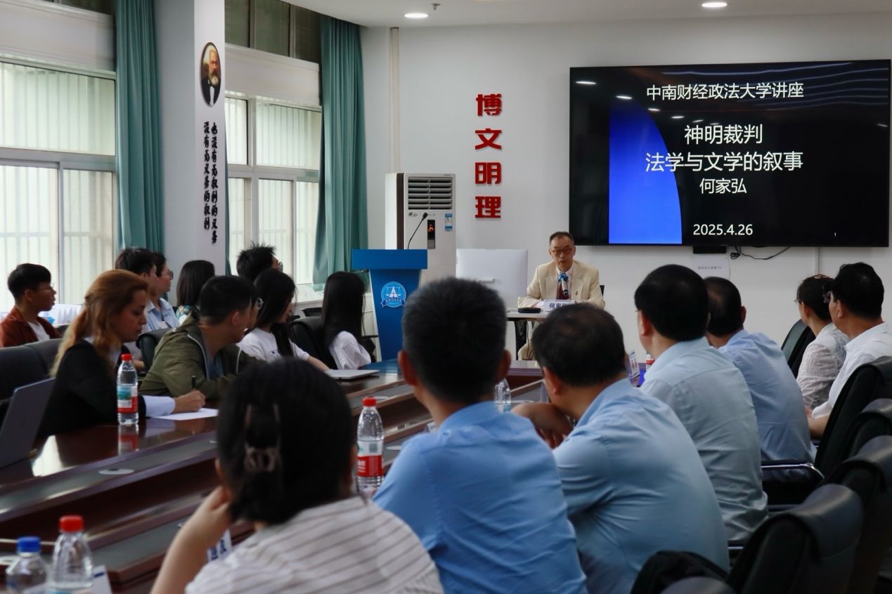 新闻网讯(学生通讯员 郭东来 摄影顾枨茗)4月26日15时,“神明裁判——法学与文学的叙事”主题学术讲座在米兰电竞·(中国区)南湖校区文治楼二楼会议室成功举办。本次讲座由米兰电竞·(中国区)“文澜学者”特邀教授、中国人民大学大华讲席教授、博士生导师何家弘教授主讲,刑事司法学院院长董邦俊教授担任主持人。沙洋人民法院院长陈静、甘肃政法大学原副院长魏克强教授、中南民族大学法学院周遵友教授、中国刑警学院原党委书记余新民,刑事司法学院党委书记张志刚、公安学科带头人杨宗辉教授、刑事辩护研究院院长胡向阳教授等嘉宾参与讲座。