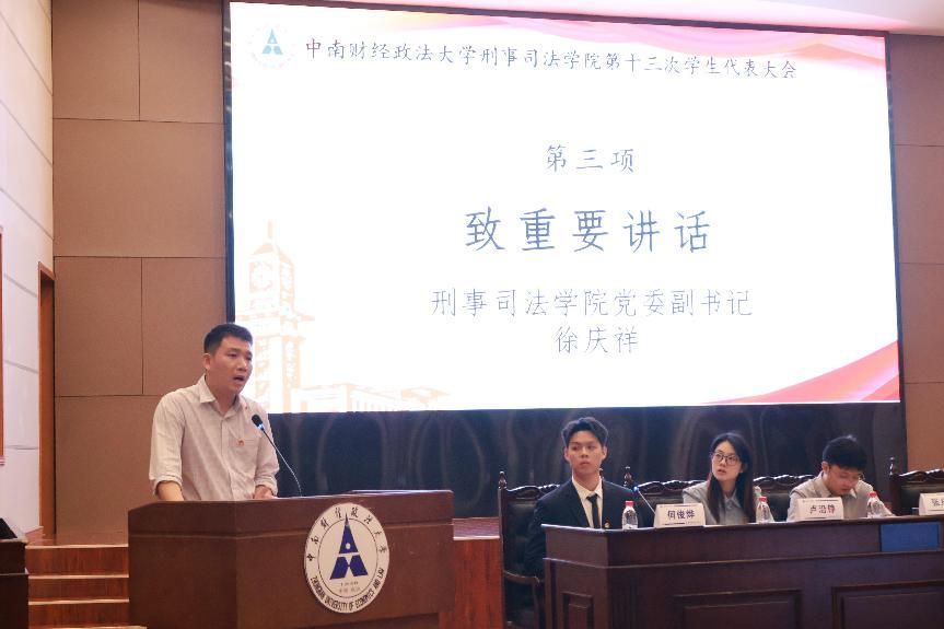 大会开幕式第三项,刑事司法学院党委副书记徐庆祥发表讲话。徐书记首先肯定了学院学生会在思想政治引领、学院文化建设、服务学生成才等方面取得的成就。号召大家努力开创刑事司法学院学生会工作新局面,为学院的发展贡献智慧和力量。他强调,学生会作为学院与学生之间的桥梁和纽带,要始终坚持以学生为中心,积极倾听学生心声,反映学生诉求,维护学生权益,全心全意为学生服务。同时,徐书记还对学生会成员提出了殷切期望,希望大家能够不断提升自身综合素质,增强责任意识和服务意识,勇于担当,敢于创新,为推动学院学生会工作高质量发展贡献力量。