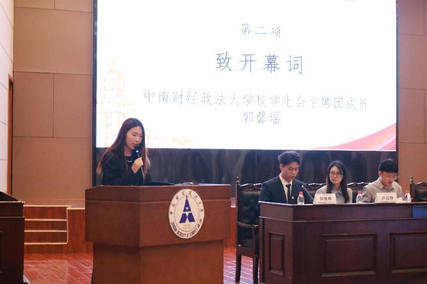 大会开幕式第二项,校学生会主席团成员郭馨瑶致开幕词。郭馨瑶希望各位代表坚定信心,振奋精神,以开拓创新的胆识魄力,锲而不舍的执着干劲,求真务实的工作作风,在实践中继续弘扬“聚是一团火,散是满天星”的刑司精神,为高质量推进学校“双一流”建设贡献刑司力量!