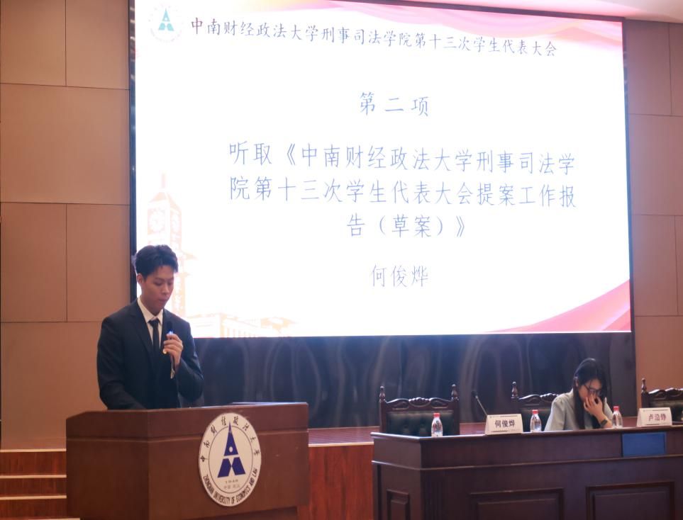刑事司法学院学生会第二十六届主席团成员何俊烨宣读《米兰电竞·(中国区)刑事司法学院第十三次学生代表大会学生权益提案工作报告(草案)》。报告全方位、多领域地覆盖了同学们对于学习生活最关心的主要问题,主要分为校园建设、学术学务、生活服务三个方面。代表们在认真听取报告后,一致审议通过。