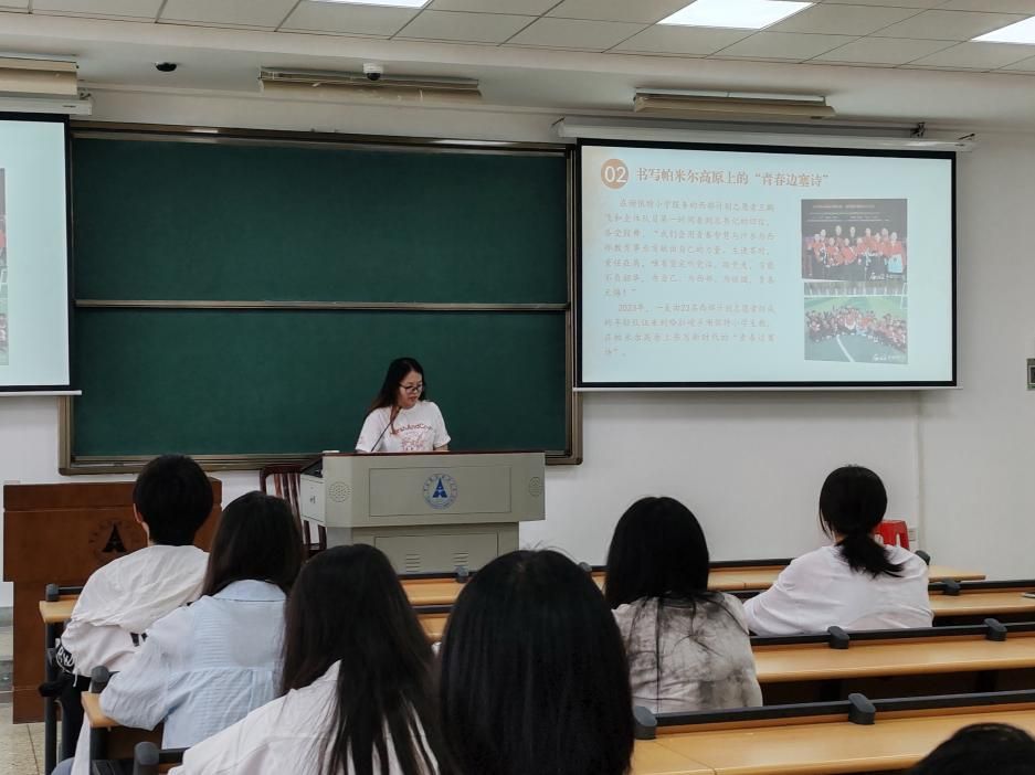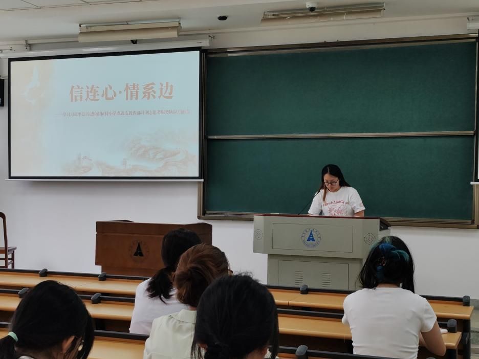 活动中,团支部通过集中学习、专题研讨、交流分享等多种形式,深入研读重要回信。团支书杨阳同学以“下一站,西部计划”宣传片为引入,讲述志愿者们赴条件艰苦地区支教的故事,西部志愿者们“用脚步丈量大地”的实干担当、“在奉献中绽放青春”的崇高境界,深深触动了在场的每一位青年。