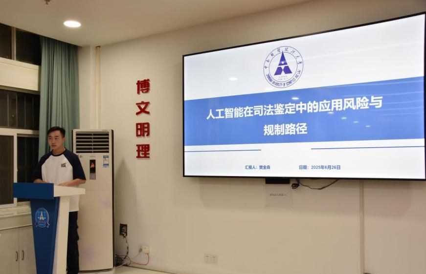 第二位发言人硕士研究生樊金森围绕人工智能在司法鉴定中的应用风险与规制路径展开,指出当前人工智能在司法鉴定中主要应用于证据分析、文书生成、风险预警等环节,同时存在技术可靠性、透明性、价值偏差与伦理困境、权责界定、数据安全与隐私的五大维度风险,进而从技术改进、法律规制、伦理原则、行业自律四方面提出规制路径,最后展望未来技术层面新型算法发展及制度创新上动态响应型治理模式构建,强调智慧司法以人为本的技术增强范式。
