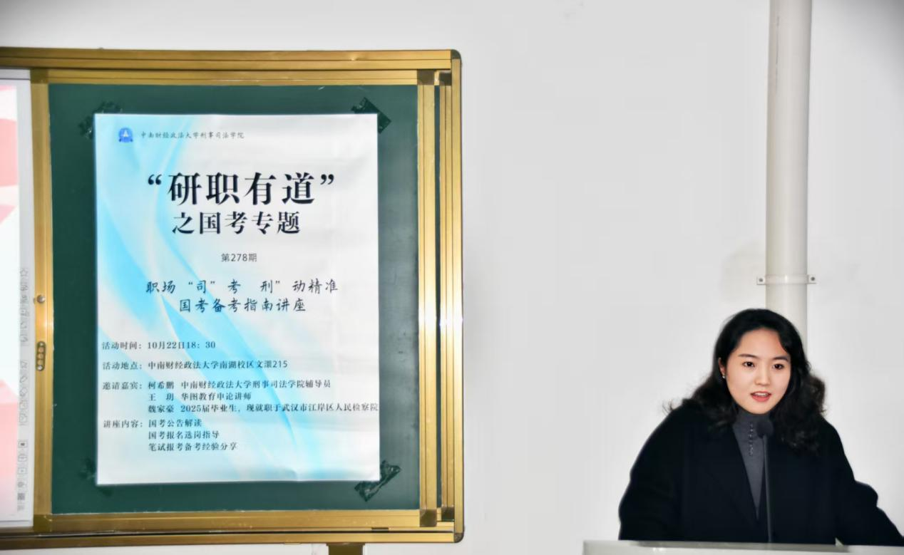 新闻网讯(学生通讯员 范晋霖 摄影 肖艺杰)为帮助我院研究生明晰公务员考试方向、掌握科学备考方法,缓解备考焦虑,10月22日晚,刑事司法学院于文澴楼215举办“研职有道”国考专题备考讲座。本次活动特邀刑事司法学院辅导员柯希鹏、2025届优秀毕业生魏家豪、华图教育申论讲师王玥,从公告解读、选岗策略到实战经验,为在场有公考意向的研究生构建起全方位备考指南。