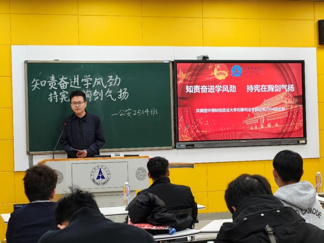 新闻网讯(学生通讯员 安宁 金宇翔 陈鑫 刘思辰 柯维蓁)12月12日,公安2504团支部在文波楼开展以“明法知礼守初心,严以律己践言行”为主题的团日活动。公安2504班班级导师赵祖斌与公安2504团支部全体成员参与此次活动。