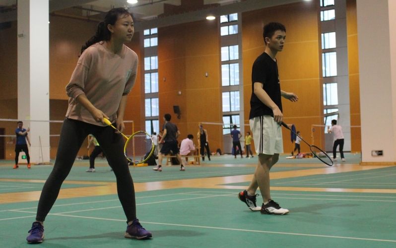 比赛时间临近,羽毛球馆内气氛热烈,参赛选手个个摩拳擦掌,准备着赛前热身活动,现场观众也对比赛满怀期待。