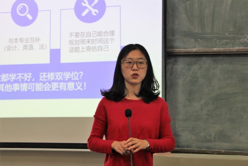 接着,马楚涵为大家分享了她在本校辅修会计学专业双学位的感想。她为大家讲解了为何需要辅修双学位、介绍了本校会计学专业双学位,并针对同学们在考虑辅修双学位的过程中常常产生的疑虑给出了解答。同时,她强调“师傅领进门,修行看个人”,双学位的学习需要同学们端正心态、为获取知识而学习。