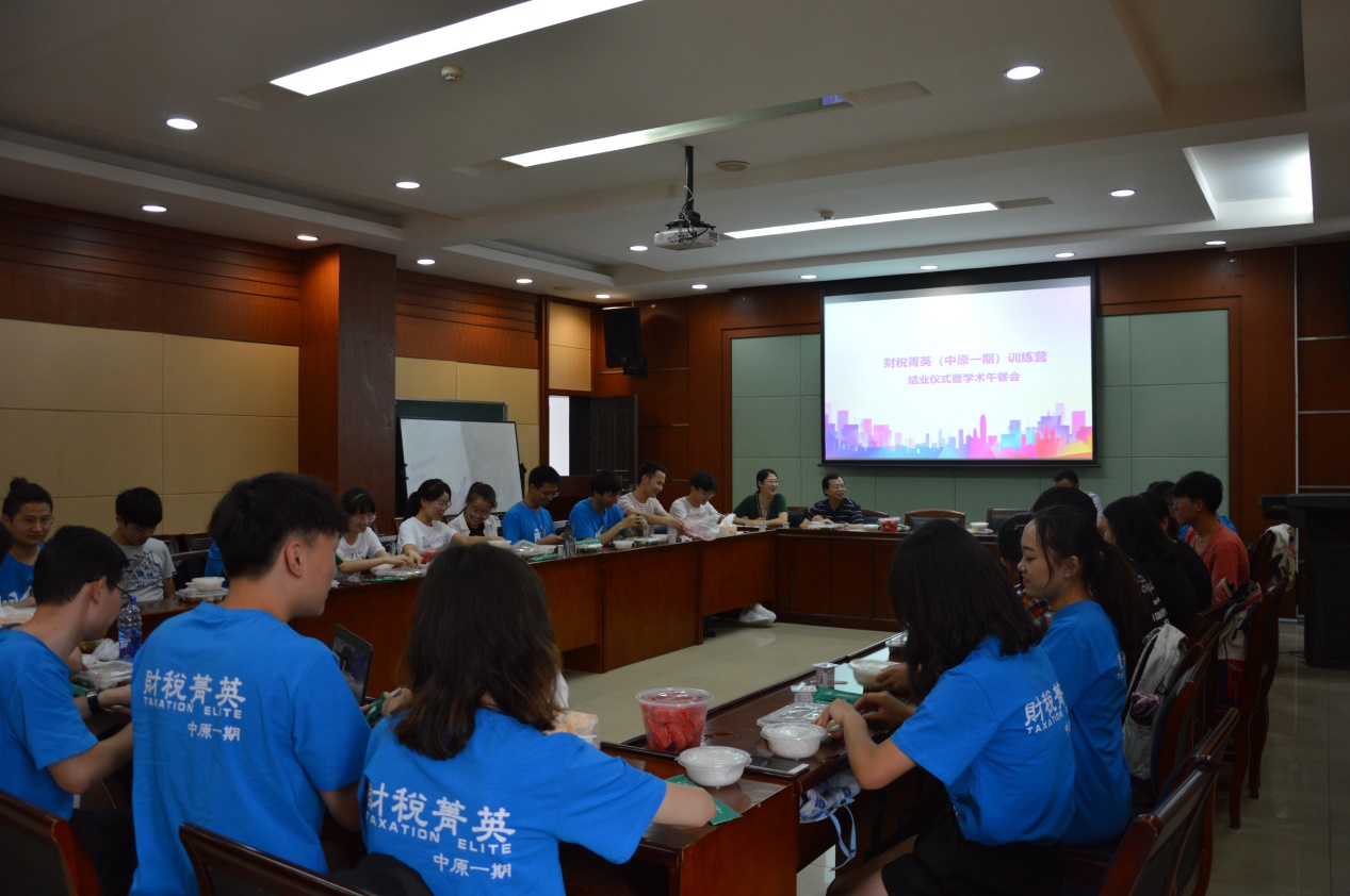 6月12日中午12点,财政税务学院财税菁英(中原一期)训练营结业仪式暨学生午餐会在文泉北楼403教室圆满举行。本次会议由科研中心负责人石凌老师主持,财政税务学院院长张克中教授、副院长薛钢教授、院党委熊思宏副书记、鲁元平副教授,孙玉坤助理教授出席了本次会议。