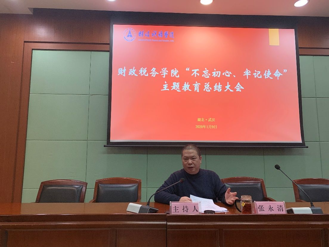 会议首先学习了习近平总书记在中央主题教育总结大会上的重要讲话精神、教育部直属高校“不忘初心、牢记使命”主题教育总结视频会议精神以及学校有关主题教育总结工作的统一部署。张永清总结通报了学院主题教育开展的总体情况、取得的主要成绩、形成的长效机制、存在的主要问题以及下一步努力的方向。张永清讲到,财税学院“不忘初心、牢记使命”主题教育工作在校党委及校督导组的精心指导下,紧扣总体要求、根本任务和具体目标,坚持“四个到位”,紧紧围绕立德树人,将主题教育与新中国成立70周年、筹备召开学校第四次党代会、推进学校“双一流”建设和各项事业改革相结合有序开展。学院党委带领全院党员师生对照党章党规党纪,深入开展学习调研,多措并举地检视问题、分析问题、解决问题,集中查找了一批广大师生员工关心关注的难点问题,集中研究解决了一批当前存在的突出重点问题,确保了主题教育取得实效。通过开展主题教育,学院党员干部和师生党员的理论学习有了新收获,思想政治有了新提升,担当作为有了新动力、行政效能有了新提高;全院师生将后续的中心工作中不断巩固和拓展主题教育活动成果。