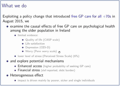 该篇论文主要研究公共医疗收费制度改革对于公众心理健康的影响。医疗保险在保障公民健康方面具有重要作用,对疾病的不确定性提供保障的同时也影响公民面对疾病时的心理。医疗保障对于当前全球蔓延的新型新冠肺炎疫情的有效治疗也有着重大影响,因此本论文具有很好的现实意义。论文介绍了爱尔兰分级诊疗的医疗体系,其中初级诊疗由全科医生负责,次级诊疗由医院负责,全科医生充当守门人角色。政府只对低收入人群看全科医生的费用实施补贴政策。