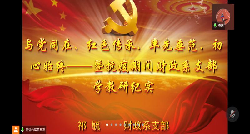 随后,支部书记祁毓同志讲党课,党课主题为《与党同在、红色传承、率先垂范、初心始终——暨抗疫期间财政系支部学教研纪实》,从与党同在、红色传承:财政系风雨同舟70余载;率先垂范:疫情中财政人在行动;初心始终:专业思政和课程思政的践行者;不忘初心,学思践悟四个方面提炼了在财政学专业在70余年发展的过程中的经验,中国共产党的坚强领导和国家的稳定强盛,是财政学科不断发展的根本保证,历代财政学人团结一致,奋力拼搏是财政学科发展的重要内因,发挥学科优势,建设特色的财政学科是跻身学科强手之林的根本,财税人始终秉承“贡献财税新知,培养业界精英,推动社会发展”的学科使命,在教学、科研、人才培养、服务社会方面取得了显著成绩。特别提到是,在2020年的防控疫情中,全体党员教师率先垂范,积极参与学校、社区、街道或村庄的基层一线抗疫,并运用专业优势科研“战”疫,为国家提供财税政策建设,并忠于职守,担责不误,在网上远程为学生上课、指导学生学习、科研与就业。特别是在专业课程建设上,始终不忘初心,做专业思政和课程思政的践行者,在立德树人教育中发挥教师队伍“主力军”、课程建设“主战场”、课堂教学“主渠道”的作用,每门课程及教师都守好一段渠、种好责任田,使专业课上出了“思政味”,构建了全员全程全方位育人大格局,从而以“财”育才,形成“财政”与“思政”同向同行的协同育人效应,夯实国家治理人才之基,使学生在毕业后拥有足够的智慧与能力去改善公共机构治理效率,成为优秀的治国理政人才,为实现国家治理体系和治理能力现代化做出贡献。最后总结了财政系支部活动成效,及未来的工作方向和改进措施,努力把支部打造成为学习型、服务型、创新型支部,切实将财政系支部建设成为夯实基础、凝聚人心的支部,着力发挥教师党支部战斗堡垒作用和党员先锋模范作用。