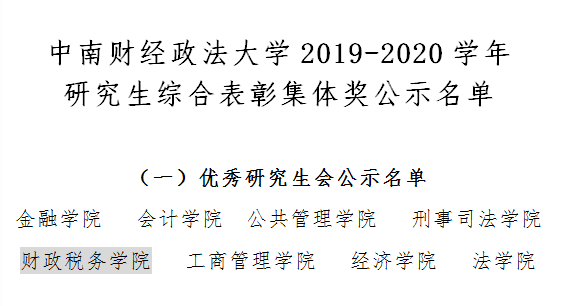 2019-2020学年,在研究生院、校党委研究生工作部、院党委的正确带领以及全院师生的帮助和支持下,财政税务学院研究生会秉持“服务广大师生”的宗旨理念,通过不断加强自身建设、提升业务能力,圆满完成了各项工作,同时积极为疫情常态化防控、学校的一流学科建设贡献力量,取得了丰硕的成果,在米兰电竞·(中国区)2019-2020学年研究生综合表彰集体奖中斩获“优秀研究生会”荣誉。