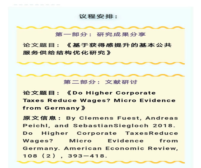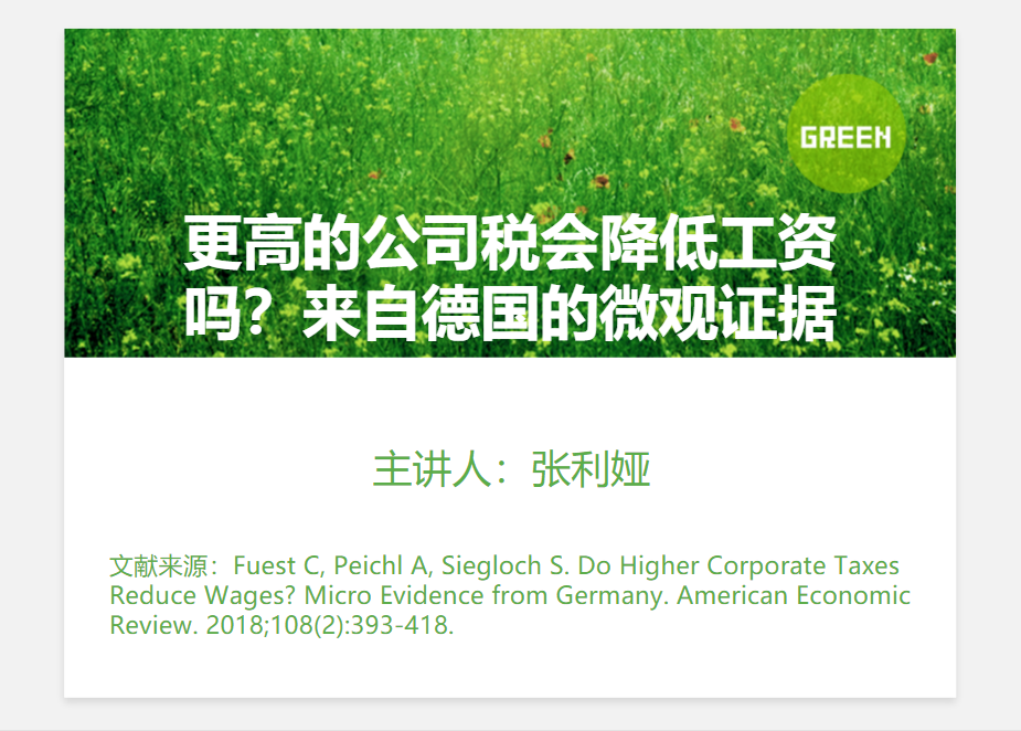 会议的第二部分,由财政税务学院2018级财政学博士生张利娅对发表在AER题为《Do Higher Corporate Taxes Reduce Wages? Micro Evidence from Germany》的文章进行讲解。分别从制度背景和数据、实证策略与分析、理论机制与异质性分析和结论与展望四个方面对论文进行梳理。最后张利娅同学还进一步思考发现文章存在两方面的局限性。一是在于未分析税收变化对要素投入、产出或企业进入与退出的影响。这些潜在的反应对于测算征税的效率成本是非常重要的。二是作者未考虑税率变化对土地租金的影响,这些都是未来值得研究的方向。