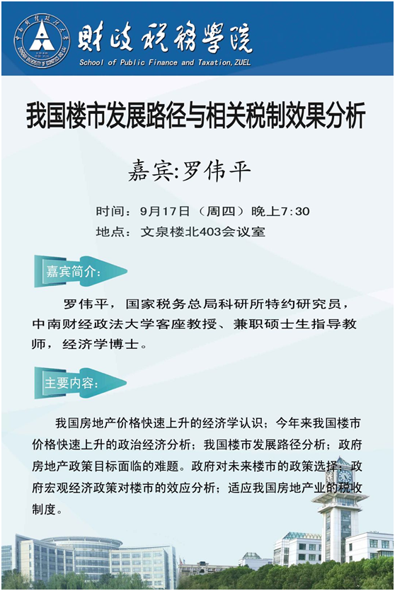 【讲座预告】罗伟平:我国楼市发展路径与相关税制效果分析