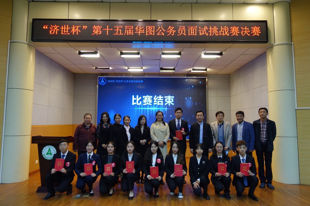 最终经过激烈的角逐,8号选手霍政澍获得本次大赛的一等奖;7号选手陈文静、6号选手王娟获得本次大赛的二等奖;4号选手孙若蓓、10号选手何玉蓉和5号选手杨浩宇获得本次大赛的三等奖;2号选手李炤辰、3号选手袁阿凌、9号选手费凡和1号选手张梓怡获得本次大赛的优秀奖。最后选手们与领导嘉宾们合影留念,至此第十五届“济世杯”华图公务员面试挑战赛决赛圆满落下帷幕。