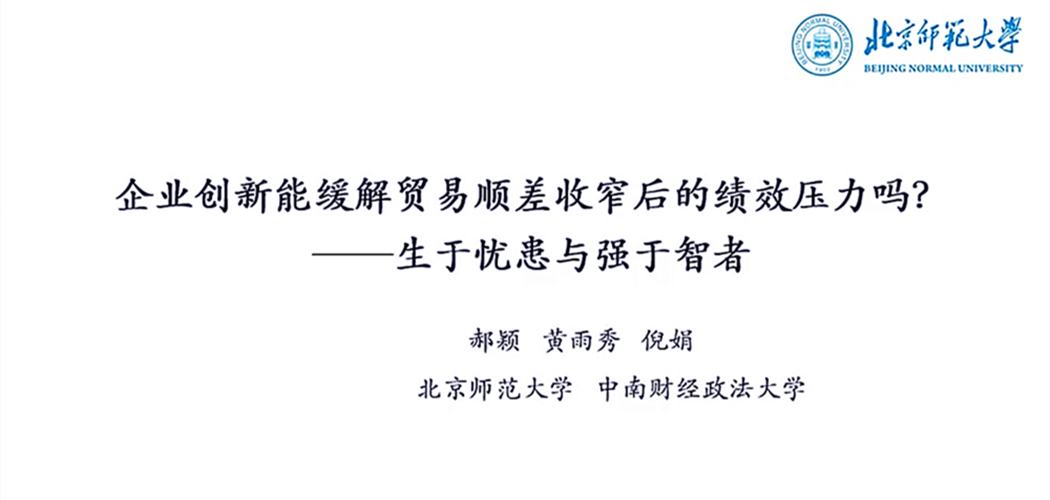 2020年11月27日上午9点半,文澜财税论坛(第5期)线上学术讲座在腾讯会议顺利举行。北京师范大学经管学院学术委员会委员、美国哥伦比亚大学商学院访问学者郝颖教授为我们带来了题为《企业创新能缓解贸易顺差收窄后的绩效压力吗?》的学术讲座。本次讲座由财政税务学院倪娟老师主持,众多师生在线参与了此次讲座。