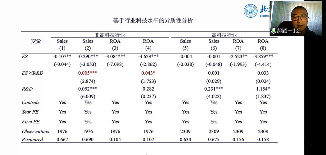 首先,郝颖教授从竞争性产品市场的创新理论出发,引出本次讲座的研究问题,即“研发创新企业能否在出口竞争压力下得以生存”以及“贸易顺差收窄情况下,创新积累对企业绩效的具体作用机制”。紧接着,郝教授阐述了我国当前的贸易顺差收窄状况:一方面,自2015年起,我国贸易顺差收窄现象越发明显,另一方面,贸易顺差收窄现象主要发生在中低端制造业以及与发展中国家的贸易往来中。通过整理大量相关学术文献,郝教授认为,创新对于企业适应复杂经营环境以及提升出口产品多样性有着巨大的推动作用,并分别从“出口目的地收入水平”、“是否属于高科技行业”、“企业规模”、“高管是否有研发背景”等四个不同的角度提出了四点假设。