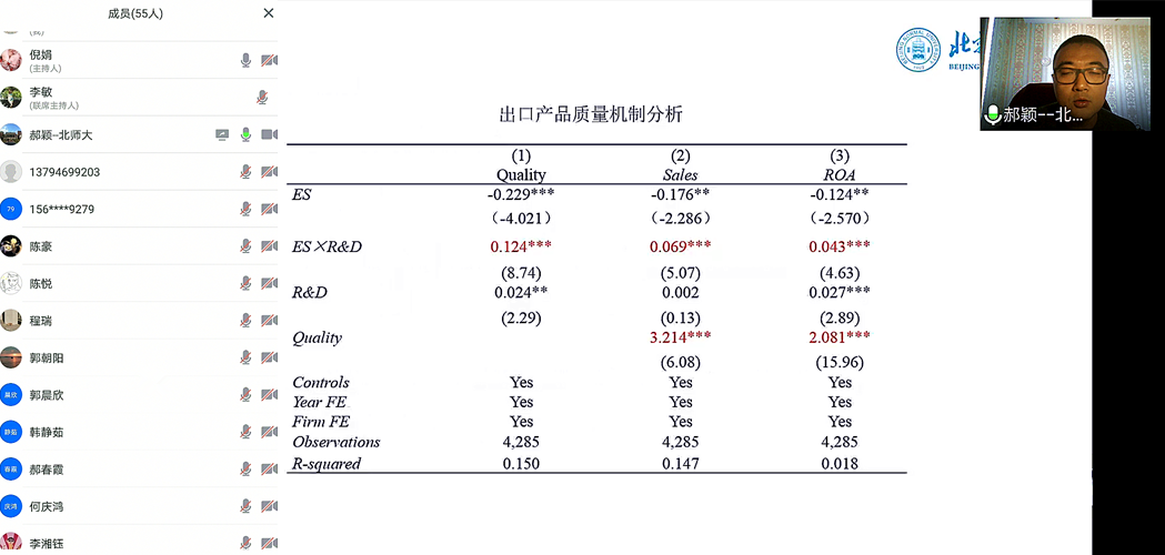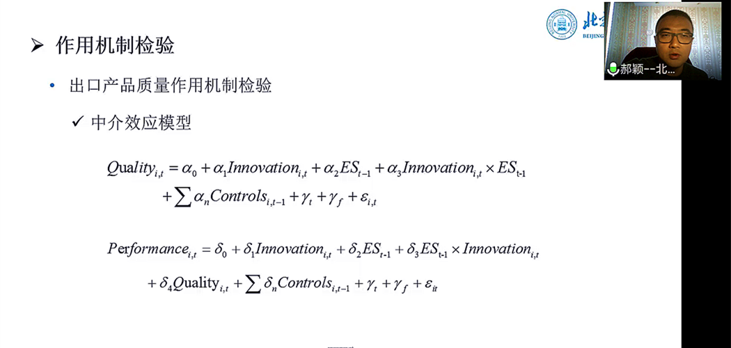 然后,郝教授从沪深两市A股制造业出口上市公司中,筛选出4285个公司作为样本数据,以贸易顺差收窄值、创新积累值作为主要自变量,选择合适的统计模型,对企业绩效值进行回归分析。郝教授分别对模型进行了稳健性检验和异质性检验,然后使用中介效应模型针对“出口产品质量和产品多样性程度”的作用机制进行检验。最后郝颖教授得出结论:贸易顺差收窄情况下,第一,研发创新企业可以实现逆势发展,其创新绩效也能得到显著提升;第二,具有更高的出口产品质量与出口产品多样性程度的企业,能够获得更多的竞争优势;第三,创积累对企业绩效的提升作用主要存在于出口高收入国家、非高科技、大规模以及高管具有研发背景的企业之中;第四,创新积累对于那些已有过产品革新的企业的绩效提升作用最为显著。