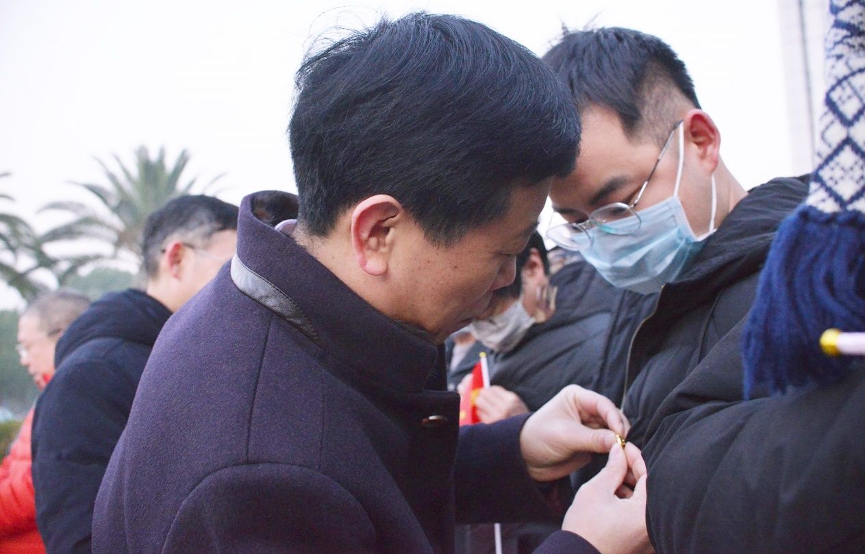宣誓过后,各位领导老师为预备党员代表佩戴党员徽章。金灿灿的党徽在同学们的胸前闪闪发光,表明了同学们志愿加入中国共产党,为党为国效力的决心。